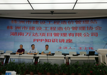 今日由株洲市建设工程造价管理协会主办,我司承办的“政府和社会资本合作(PPP)模式”的知识讲座在株洲市住房和城乡建设局11楼大会议室顺利开展。担任此次讲座的讲师是我司PPP中心副主任、环境工程工程师王士伟先生,他在本次讲座中详细地介绍了政府和社会资本合作(PPP)模式的基础知识,阐述了PPP模式产生的社会背景、模式简介、操作流程、风险管理以及交易结构等内容。本次讲座得到了株洲市建设工程造价管理站和其他相关单位的大力支持