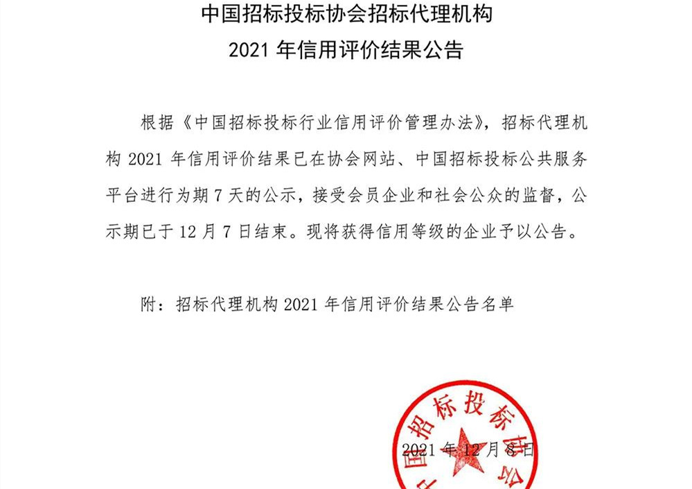 2021年12月8日,中国招标投标协会公布了招标代理机构2021年信用评价结果,我司荣获AAA级信用等级荣誉称号。