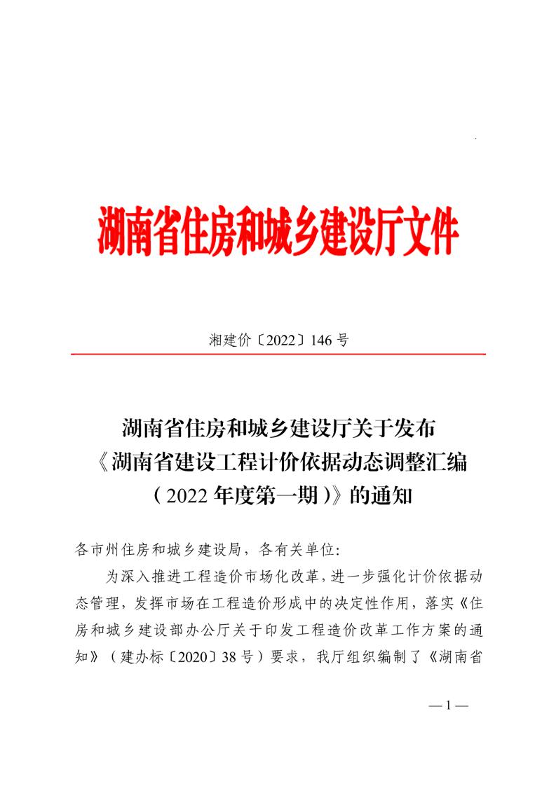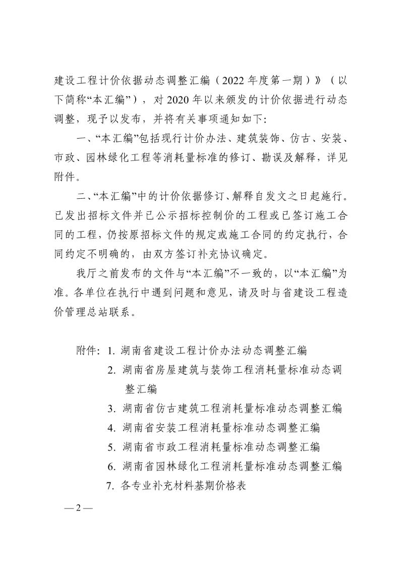 湖南省建设工程计价依据动态调整汇编(2022年度第一期)